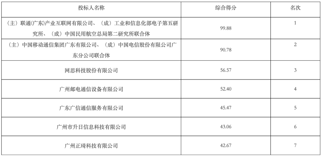 近日,项目公示了中标候选人。其中,联通(广东)产业互联网有限公司牵头的联合体以99.88分的超高分排名第一中标候选人,力压中国移动通信集团广东有限公司、中国电信股份有限公司广东分公司联合体。